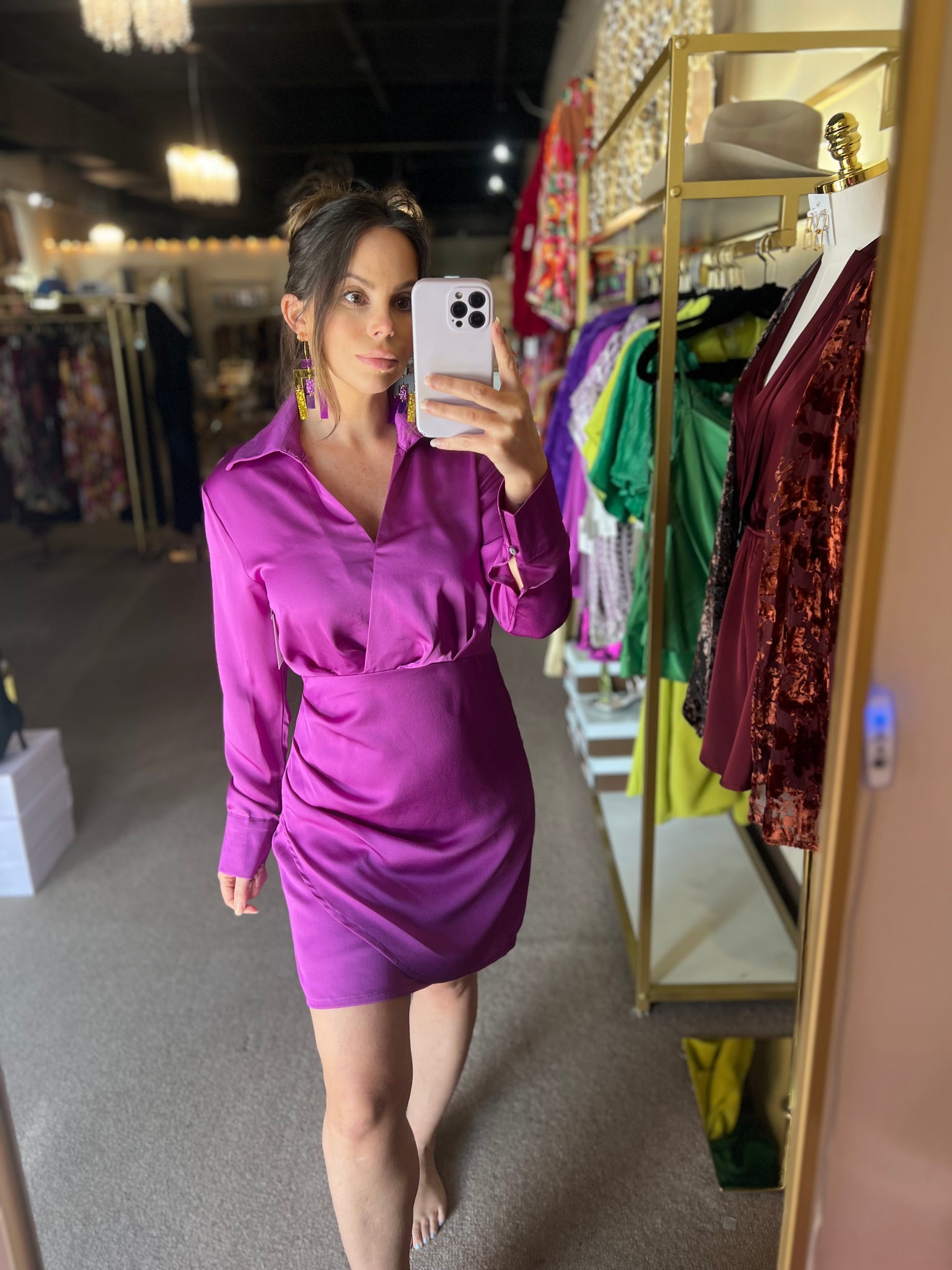 Designed with a silky satin finish, this dress features a tailored collared neckline, long sleeves, and a wrap-style skirt detail that flatters the waist and creates a beautiful drape over the hips. The vibrant purple hue radiates confidence and sophistication, making this dress a go-to for everything from cocktail parties to upscale brunches and special events.