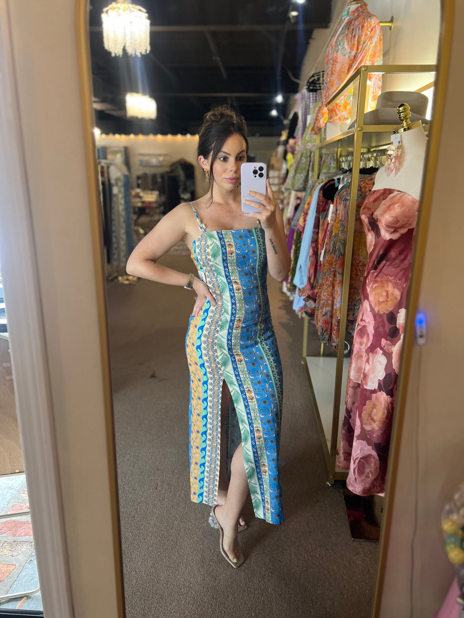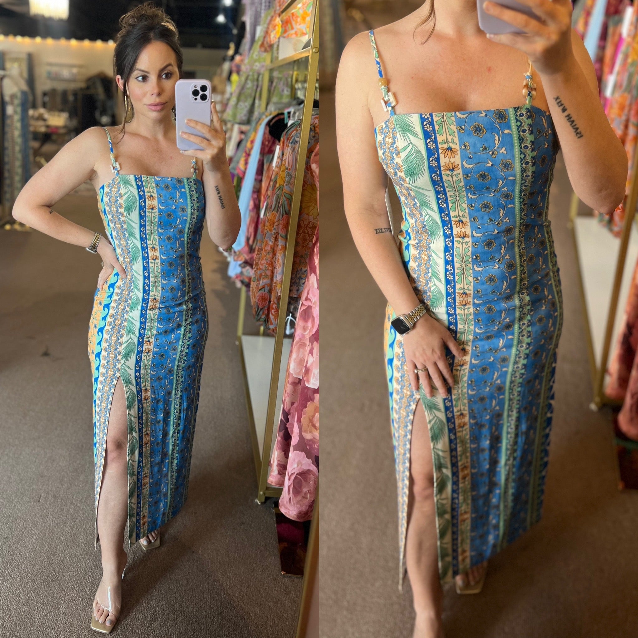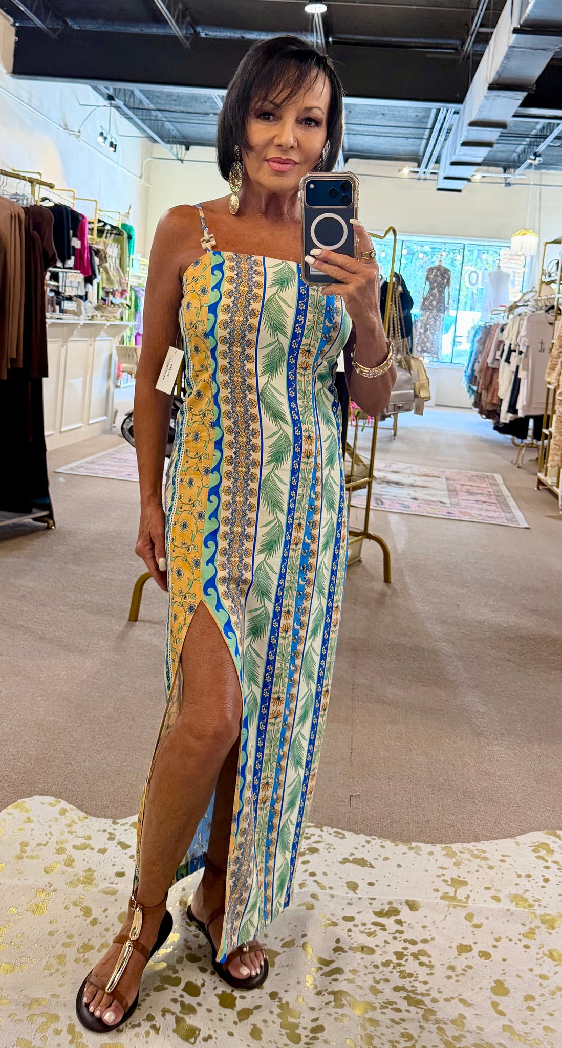 Cataiina - striped paisley rayon/linen midi dress w/tortoise trim detail. Spaghetti straps w/ adjustable ring & slider, center back closure, front side slit, princess seam detail, center back invisible zipper closure on the skirt.