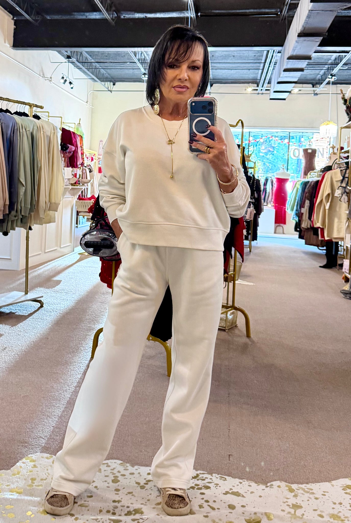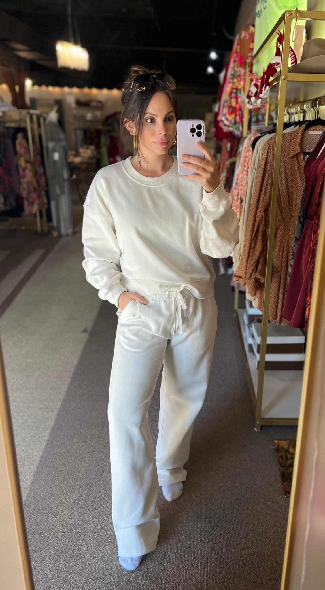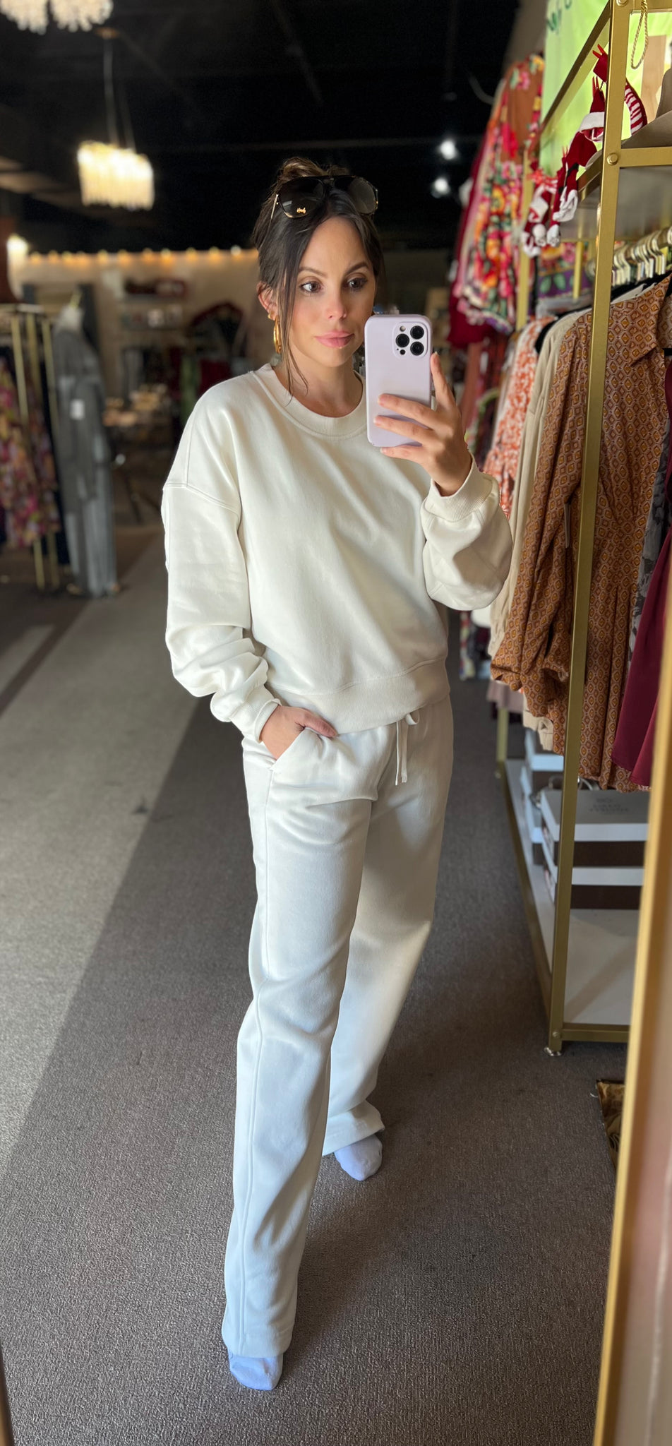 Perfect for running errands, travel days, lounging, or casual outings, this ivory two-piece set blends comfort with a clean, minimal aesthetic. Wear it together for a polished matching moment or mix and match with your everyday staples.