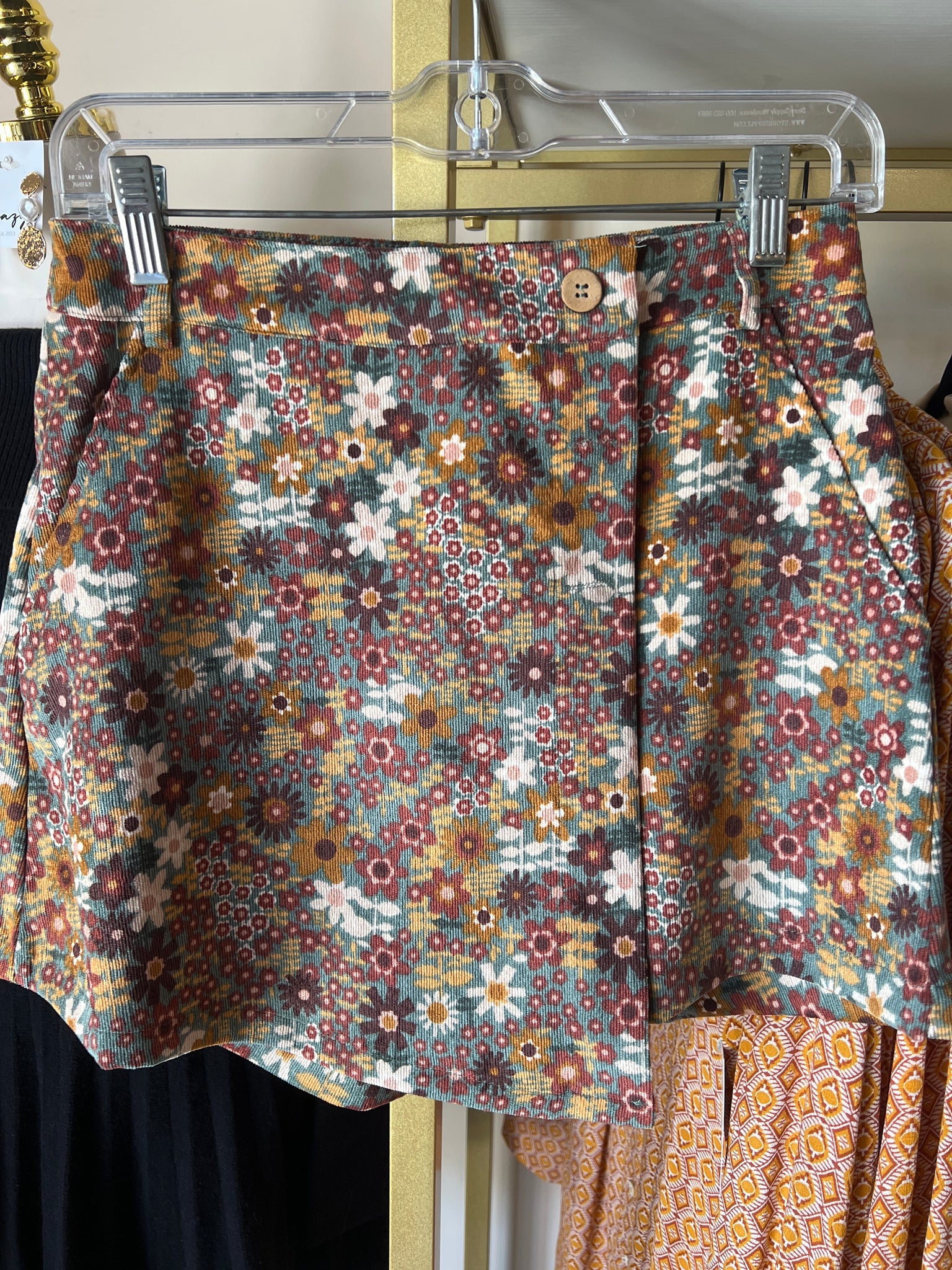 Fall Gardens - floral corduroy button down wrap skort, mid length, side & back pockets