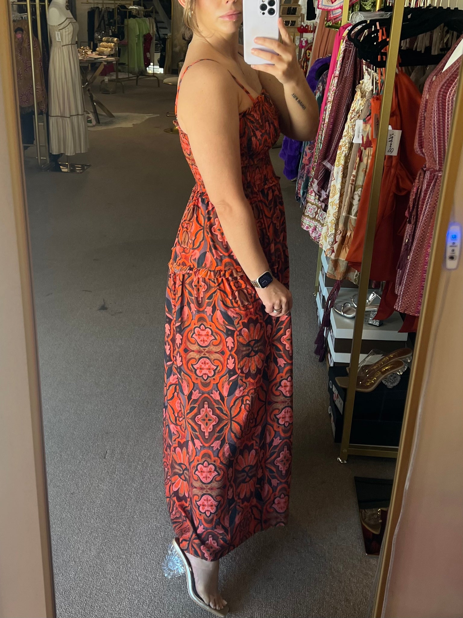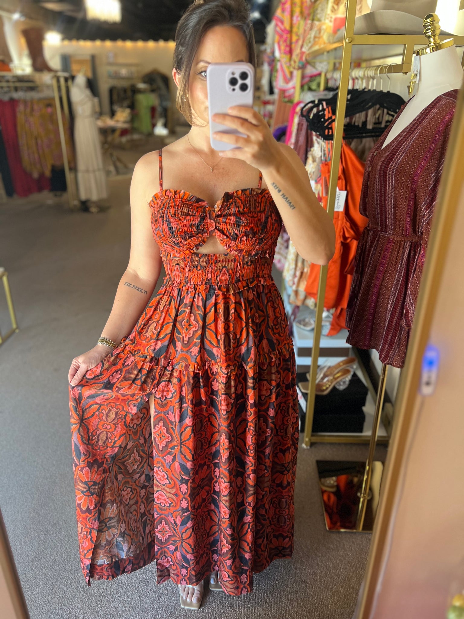 Harvest Moon - venus cut out, smocked, printed maxi dress
