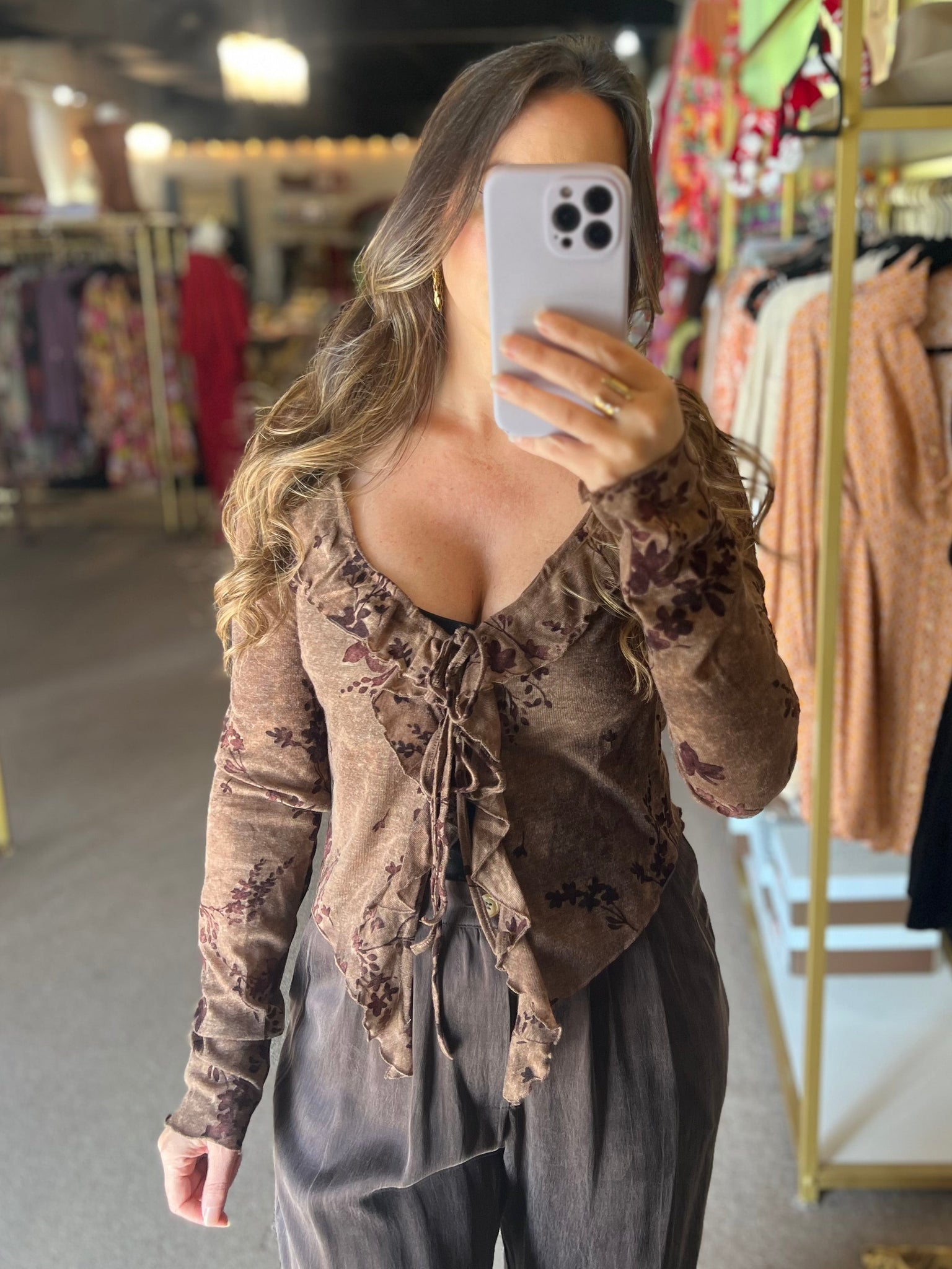 Meet your new fall staple. This boho-inspired long-sleeve top features a soft vintage-washed brown fabric with a subtle floral burnout design that gives it the perfect mix of feminine and effortless. The lace-up front adds a flattering, adjustable fit while the lightweight stretch material drapes beautifully on every body type. Dress it up with trousers or keep it casual with denim — it’s the perfect day-to-night piece.