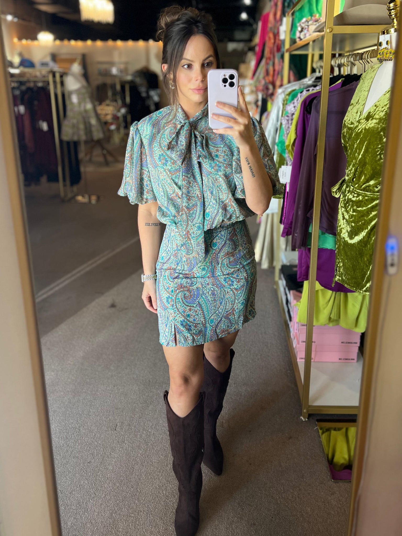 Paisley - paisley print mock neck bubble sleeve mini dress, featuring self tie at front neck, button closure at front. Invisible zipper at side. Lined & lightweight.
