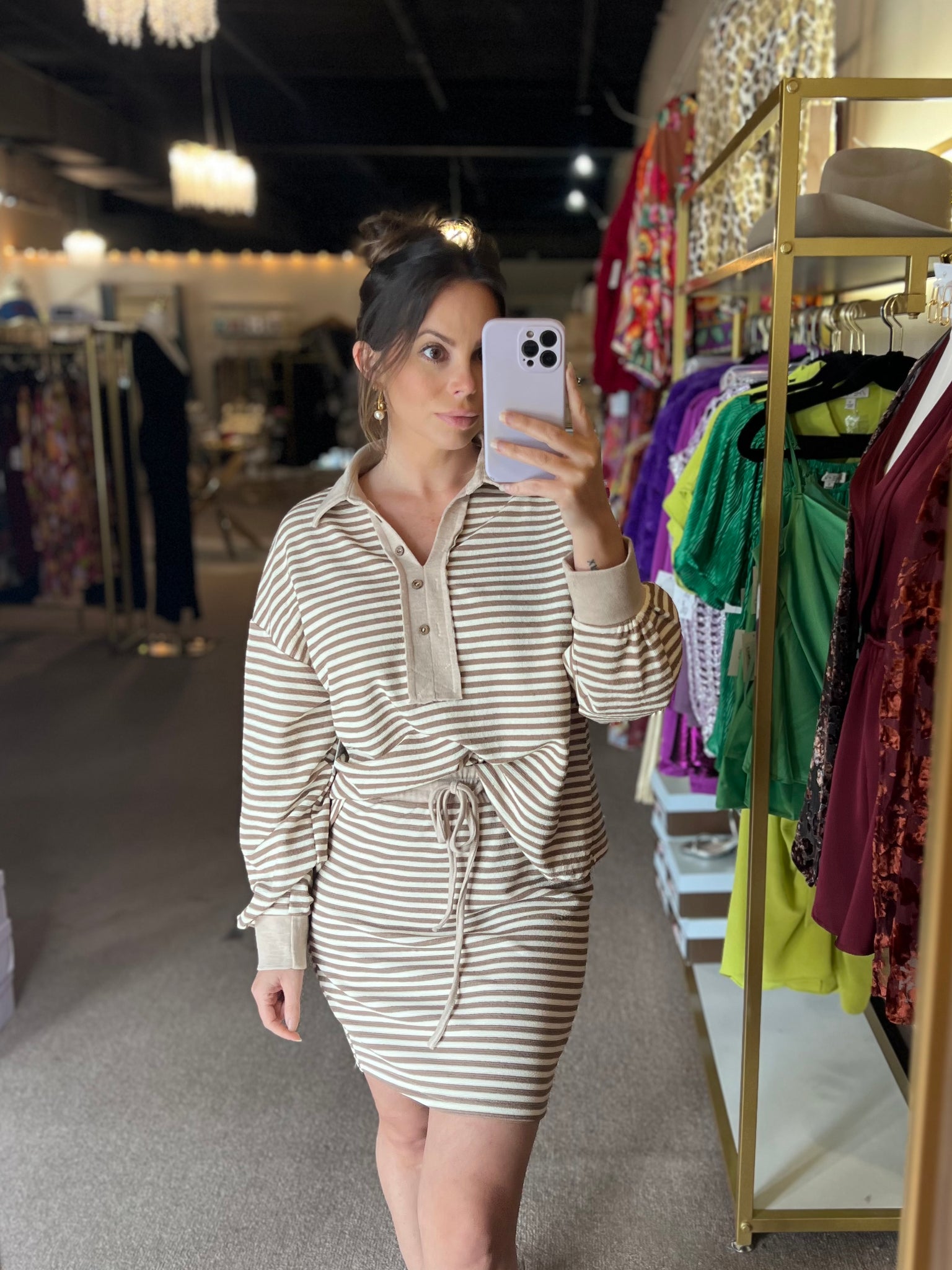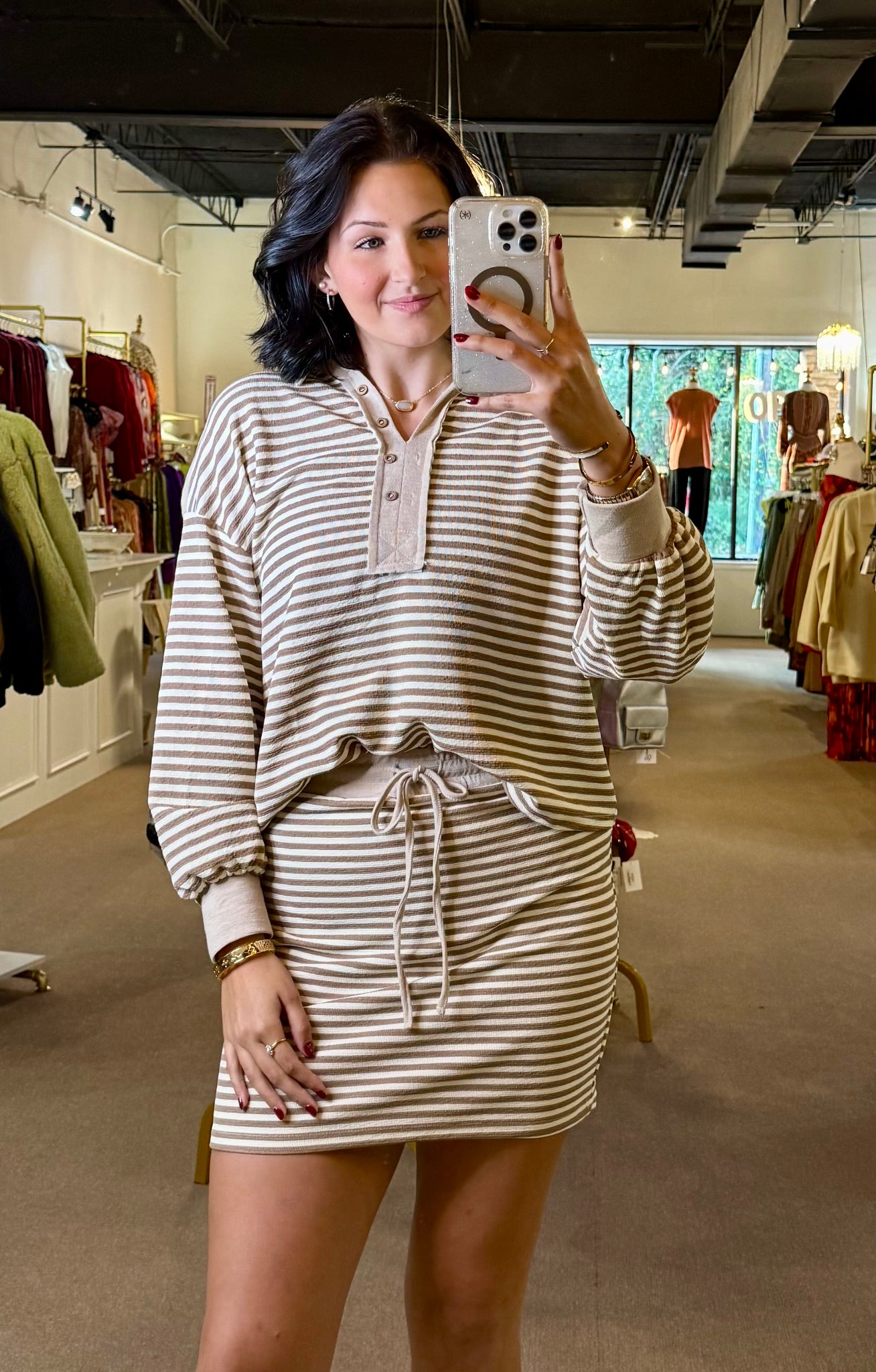 Meet your new everyday obsession: the Sporty Spice Two-Piece Set. This ultra-soft 100% cotton striped top and skirt set blends laid-back comfort with effortless boutique style. Designed in a flattering oatmeal and cream stripe, this matching set delivers the perfect mix of sporty, cozy, and polished.