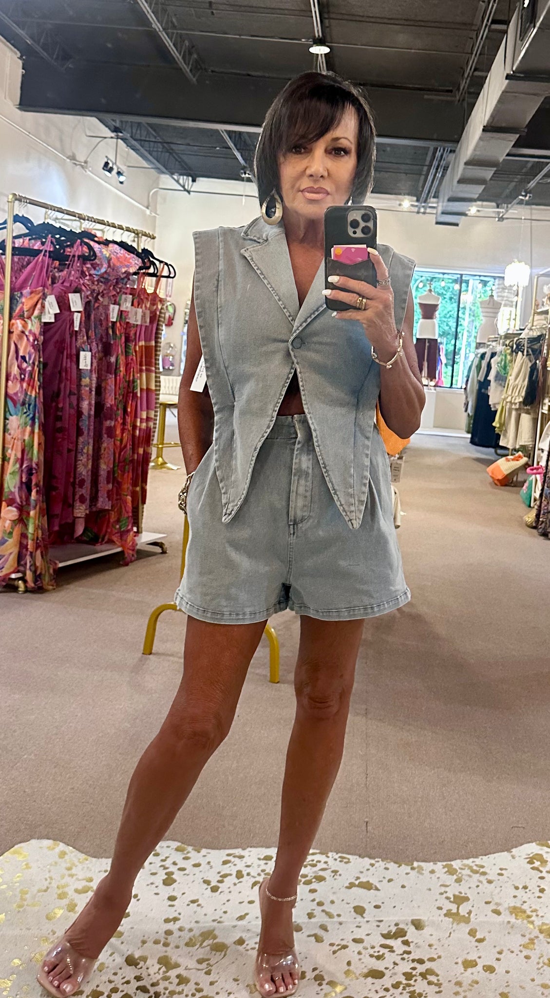 Buckle Bunny - blazer style 2fer denim romper w/connected shorts. Back elastic, zipper fly opening, vintage washed denim