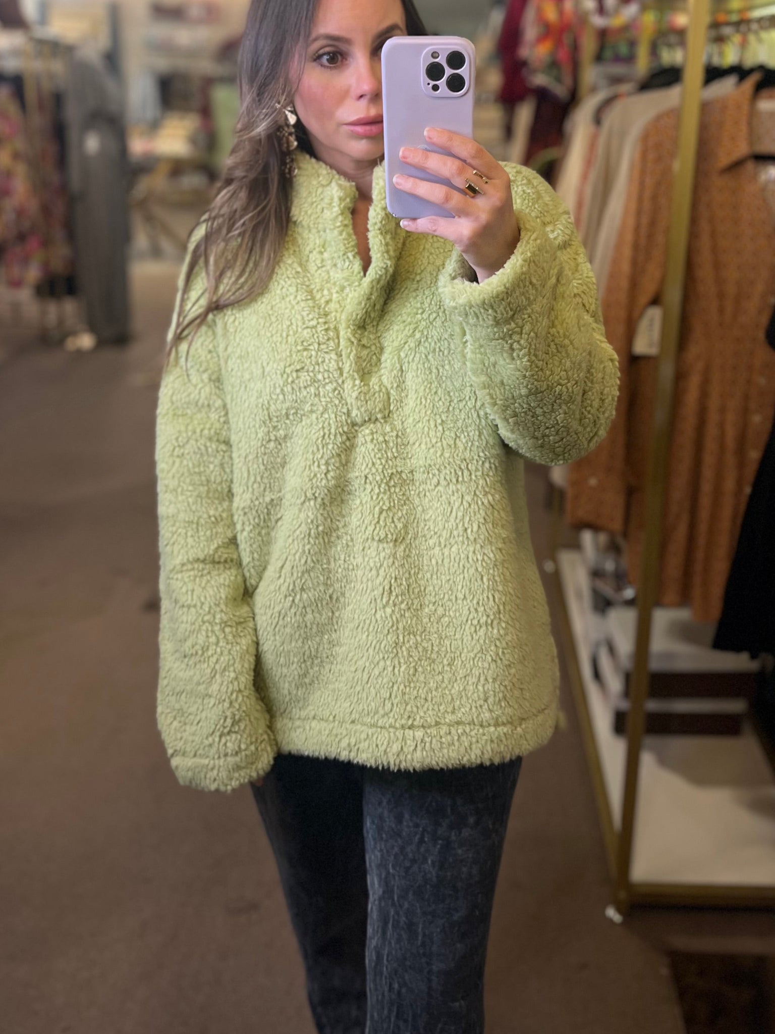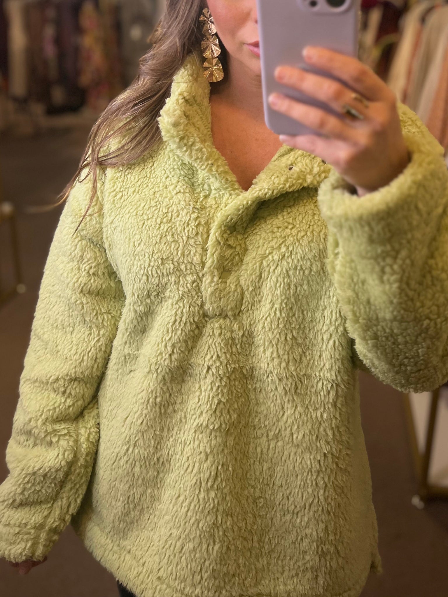 Designed with a high collar, roomy sleeves, and plush cloud-soft sherpa—this cozy pullover is perfect for cool mornings, errands, school drop-offs, or holiday events. No pockets for a clean, smooth silhouette, just warm, breathable comfort in the prettiest sage hue.
