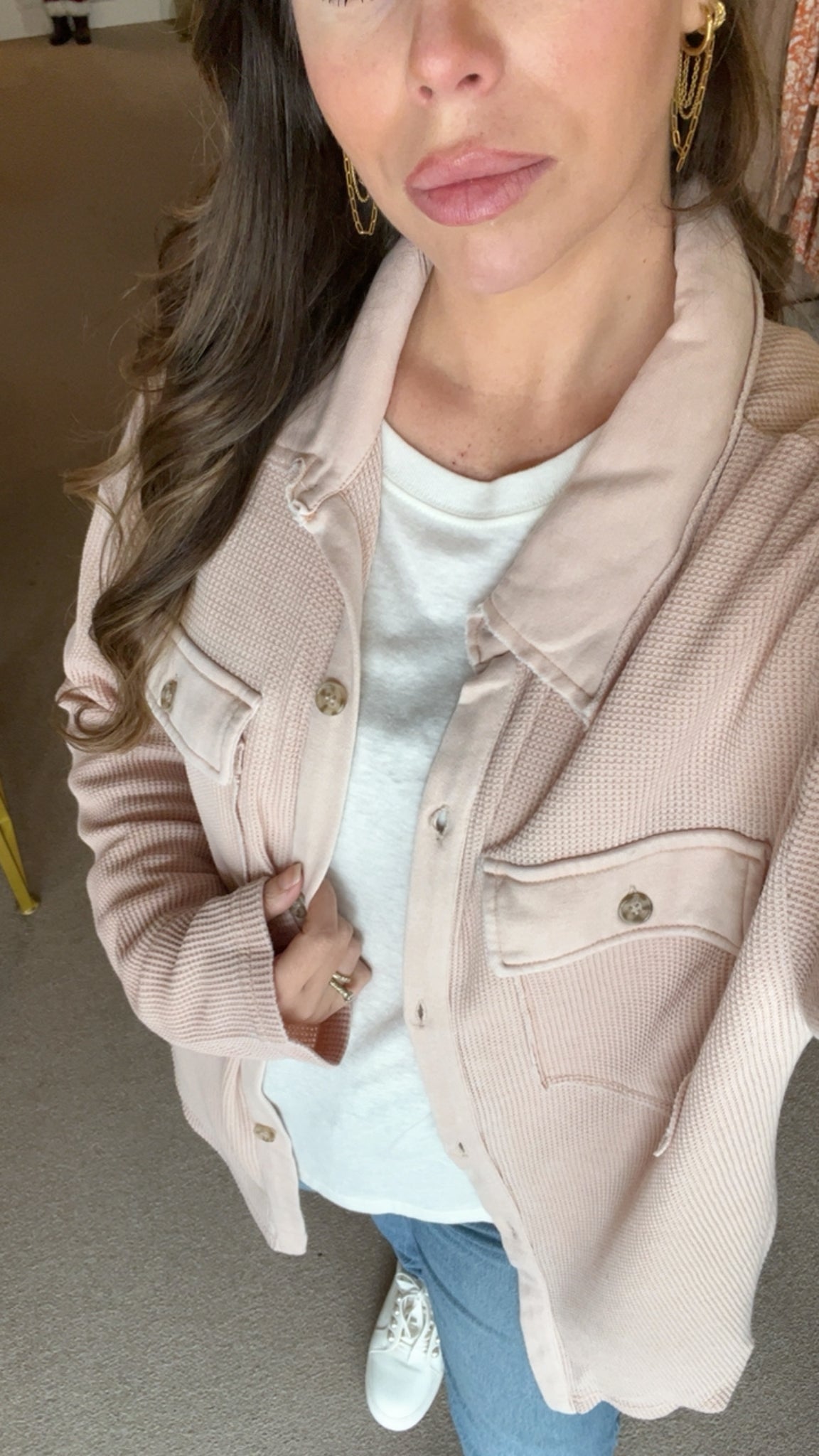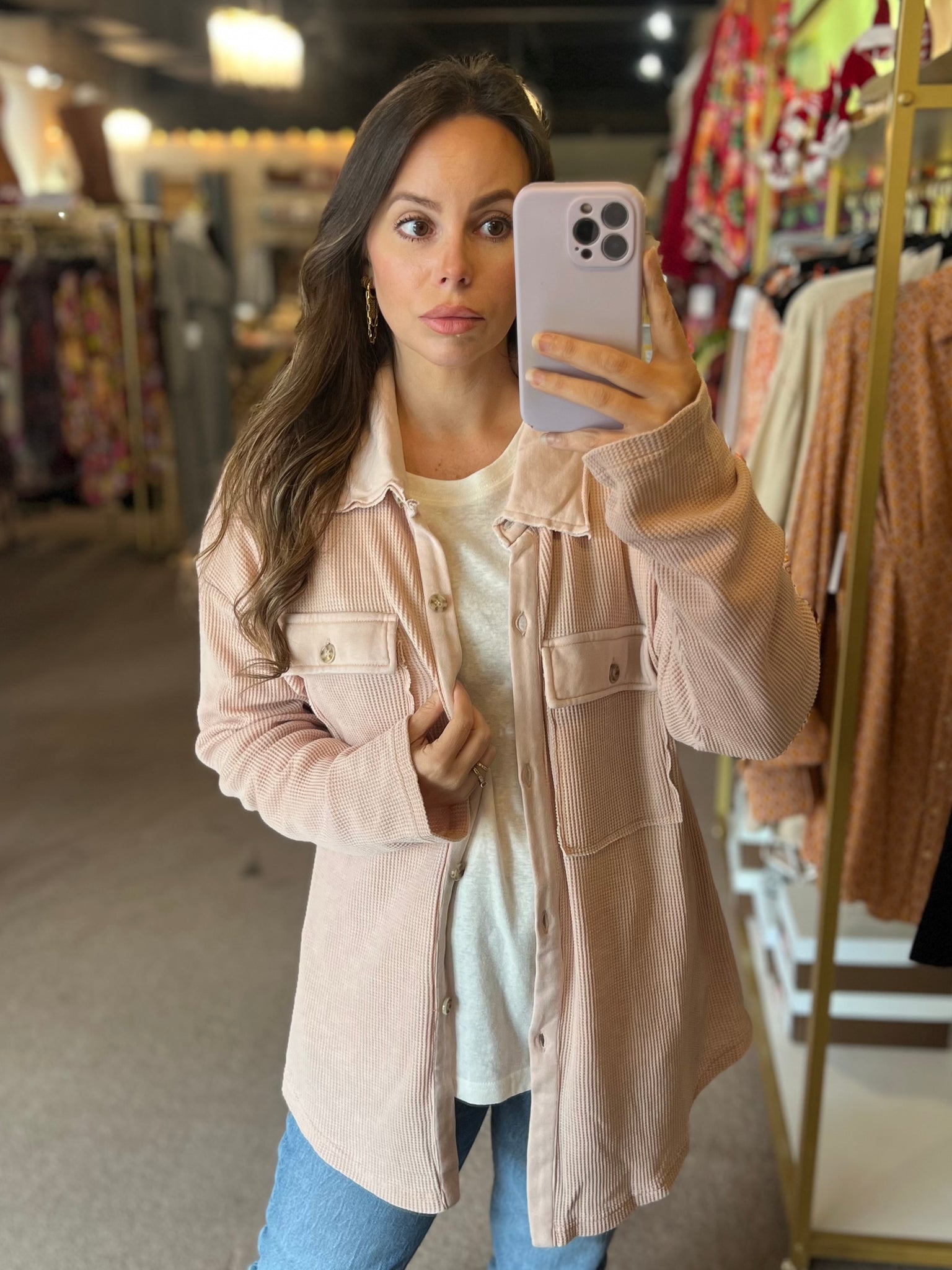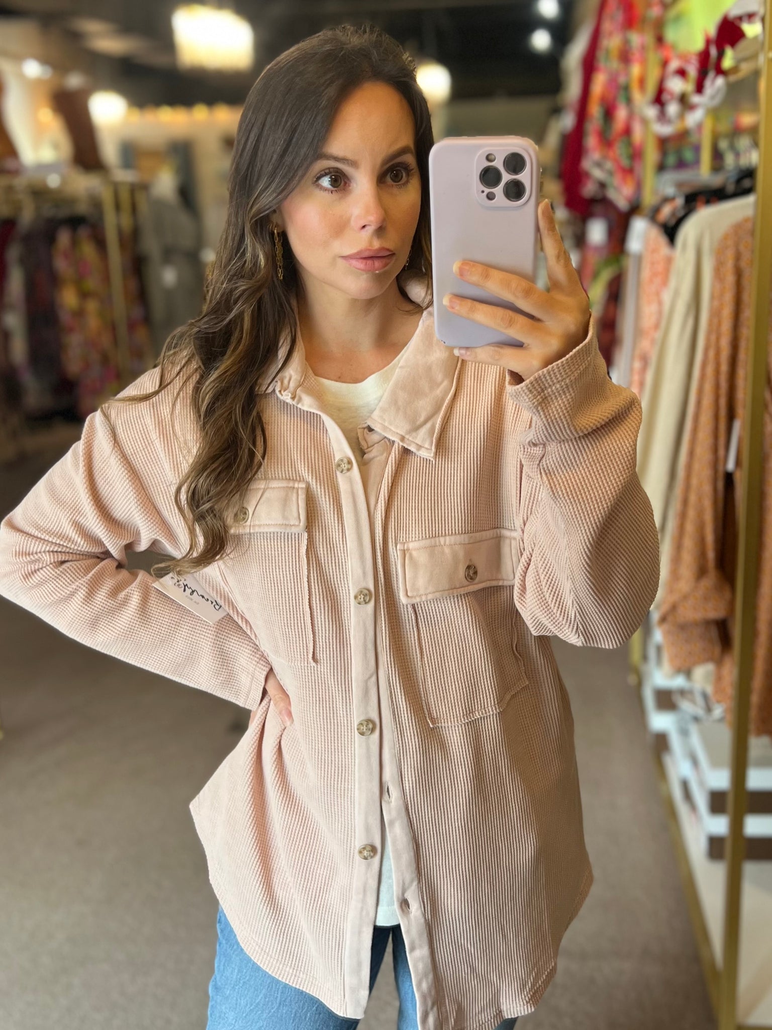 Soft, chic, and made for effortless everyday style — the Shelby Top in Cream is your new go-to layer for Gulf Coast weather. This textured button-down features an oversized fit, ribbed fabrication, and functional front pockets that make it perfect for tossing on over basics or dressing up for brunch in downtown Ocean Springs.