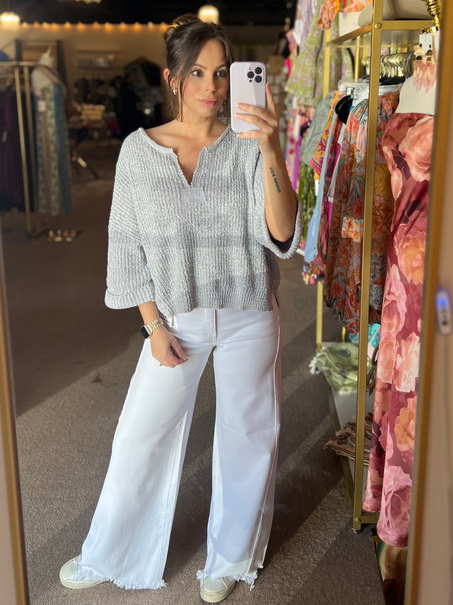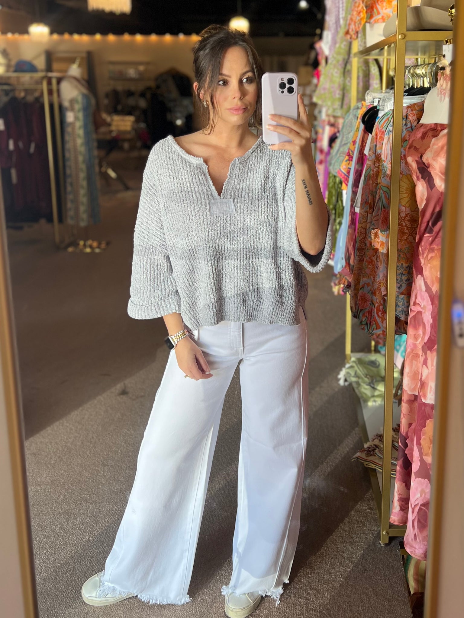 Spring Fling - slouchy, cropped sweater featuring v-neckline, 3/4 sleeves and solid patch at front & back