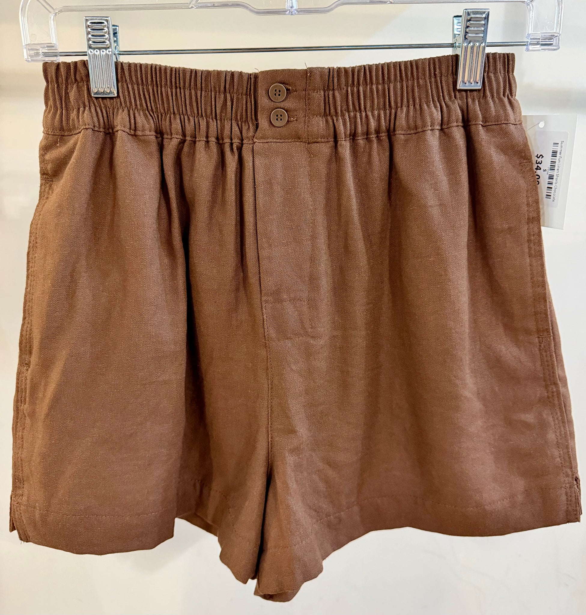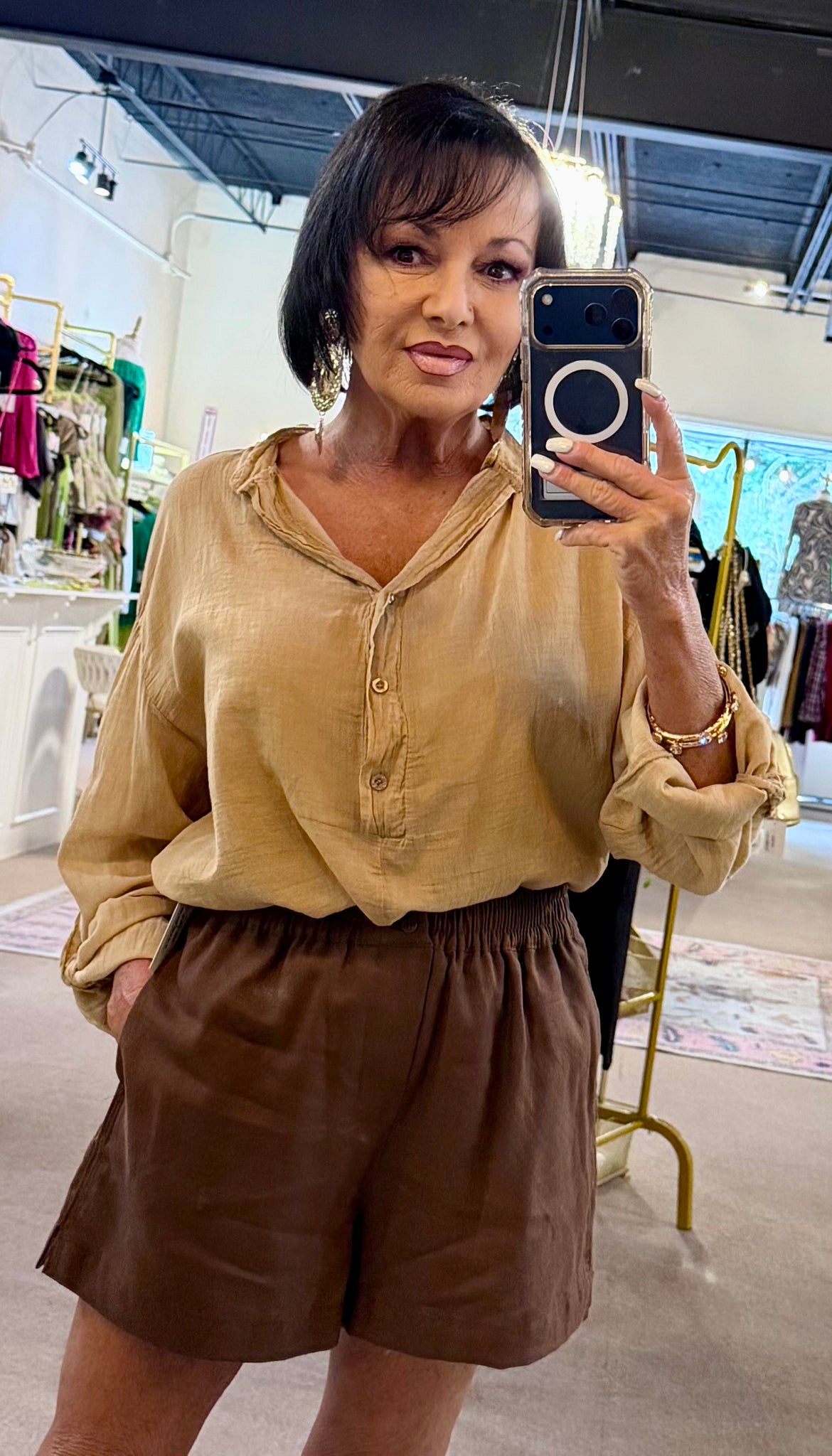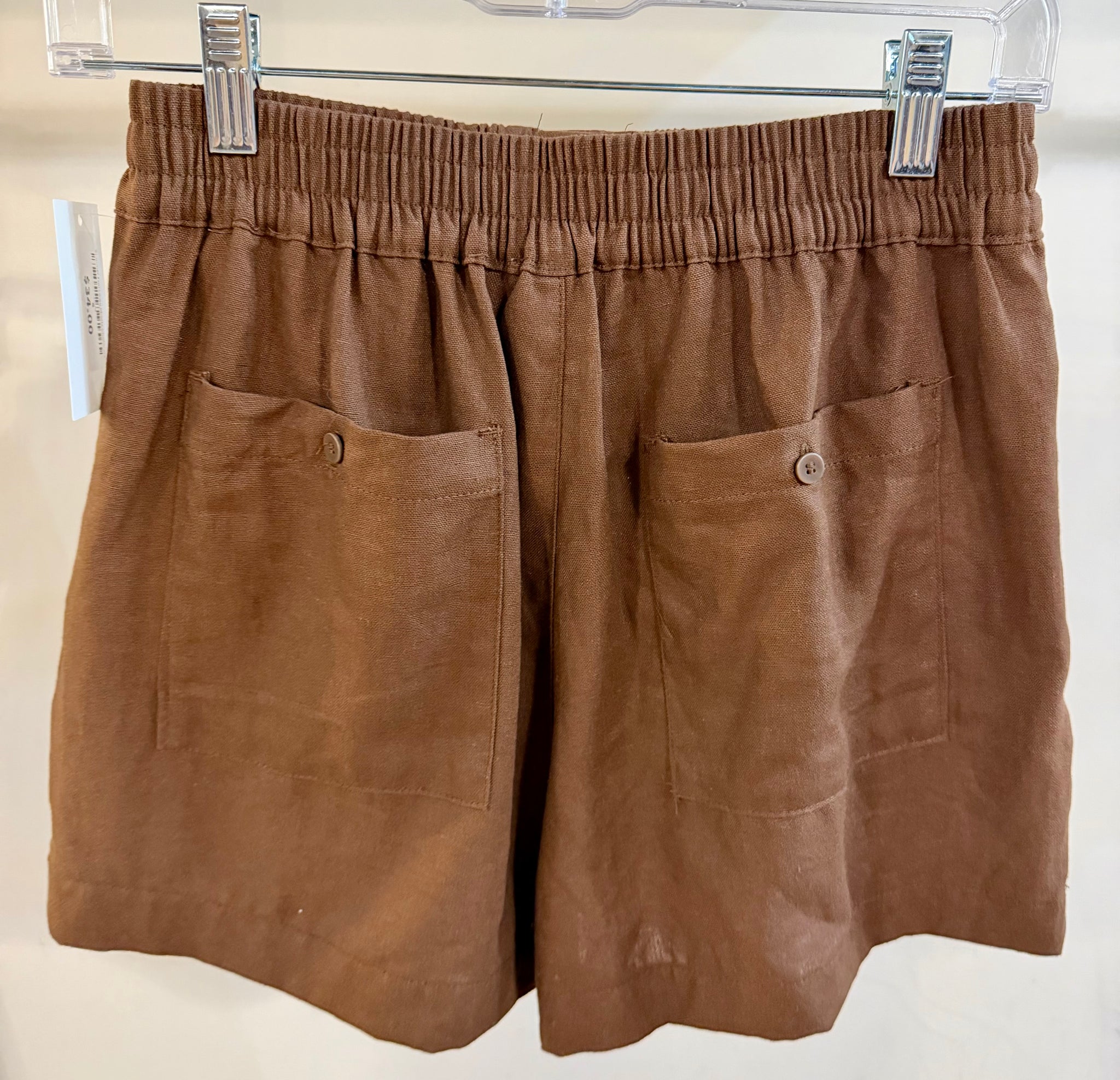 Summer Fun - linen elastic waist shorts, pull on style, front button detail & lightweight material, front pockets